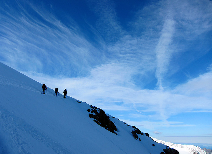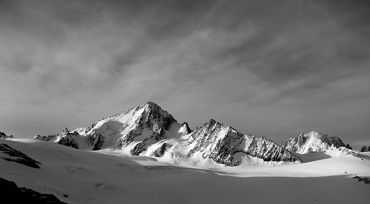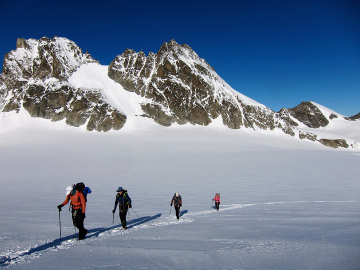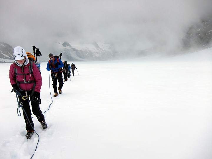 We had another squally day as we ascended the Otemma Glacier on day 4. Looking down the glacier as we approach the Col de Charmotane. |