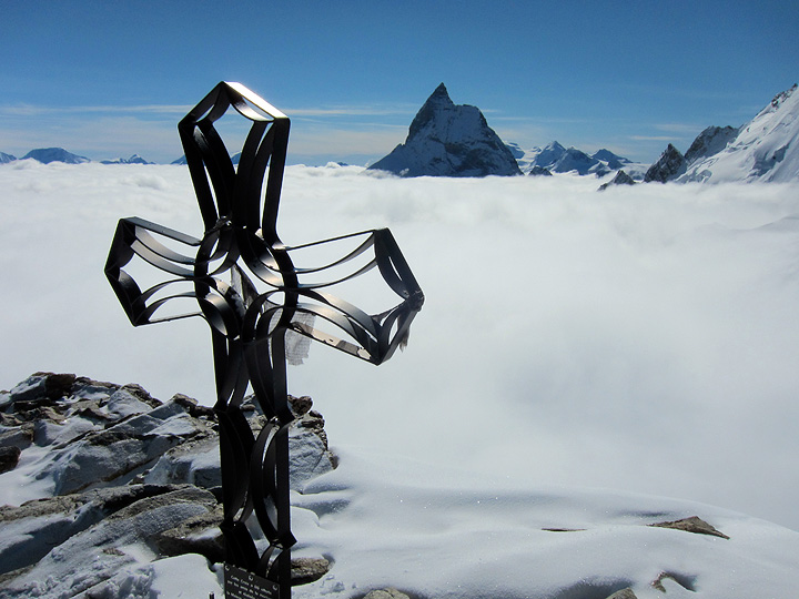 From the summit of the Tête Blanche we get our first up-close views of the Matterhorn, rising up above the valley clouds. |