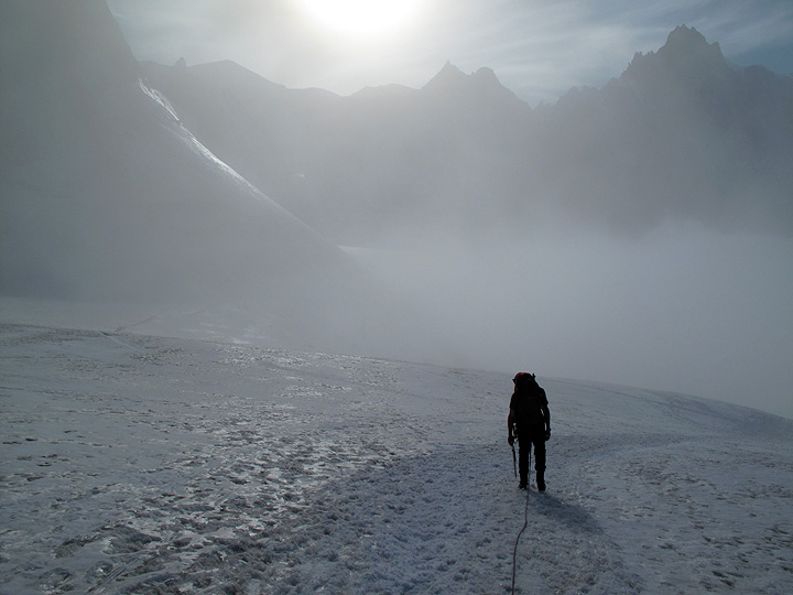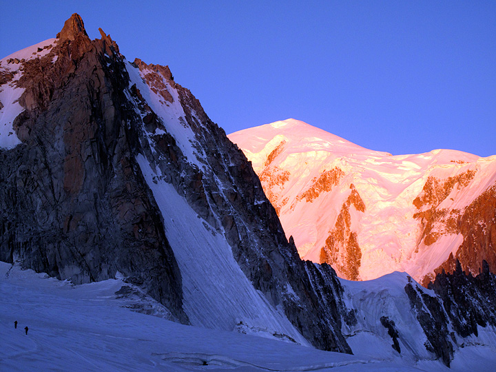 The following morning, as we walk over to the Aiguille d'Entrèves. The sun is fully on Mont Blanc behind, and just beginning to catch the summit of the Tour Ronde on the left. |