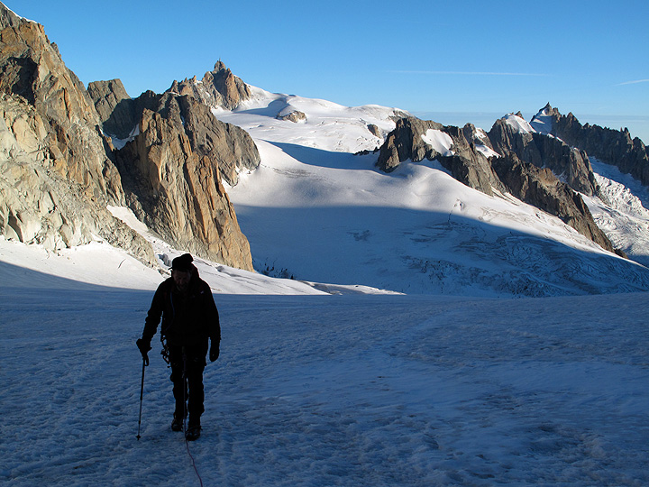 Almost to the start of the rock climbing. Here, we are looking back towards the Aiguille du Midi. |