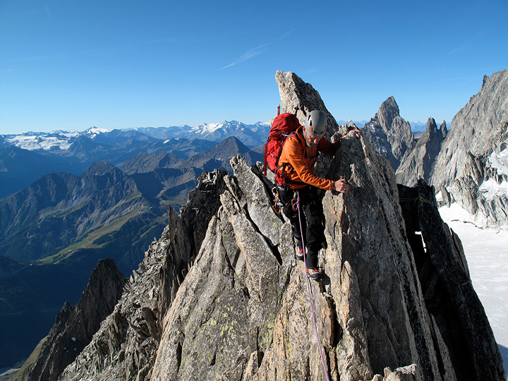 Mike Starr Joined Mark for two quick days of climbing in late August. With a good forecast, we headed straight up to the high country, climbing the East Arête of the Pyramid du Tacul on the first day, and the Traverse of the Aiguille d'Entrèves on the second. |