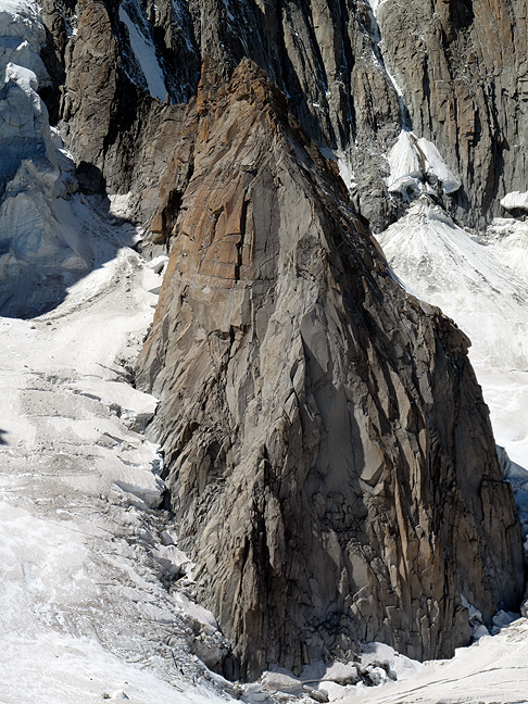 The Pyramid du Tacul. This photo was taken from the lift as we road back across the Vallée Blanche on our second day, returning to Chamonix. Roll your mouse over to see the East Arête route. |