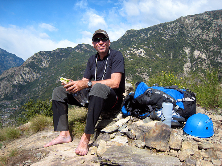Mark enjoying his sandwich, and freedom from rock shoes at the top of Lo Dzerby. |