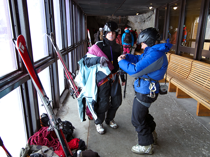The big gear-up in the hallways of the Aiguille du Midi lift station, whose amenities, always improving, now include benches for the weary sight seer. |