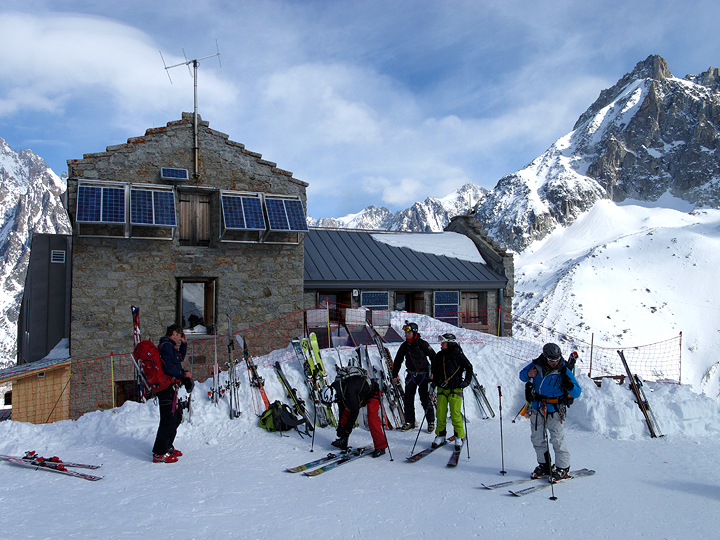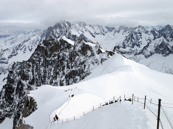 Even a bit of sunshine starting to burn through the high clouds. We pause for a break below the Aiguille du Midi. |
