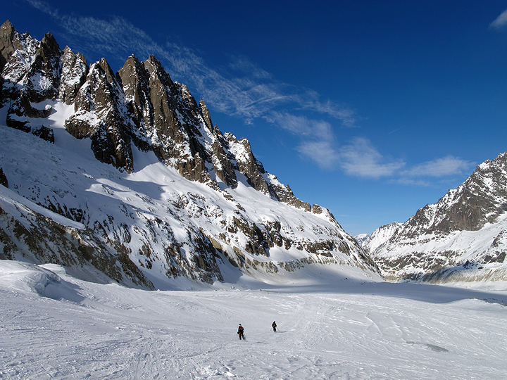 Once safely through the icefall section, it's time to cruise and enjoy the views. The blue sky wins out in the end, and it's another lovely day on the Vallée Blanche! |