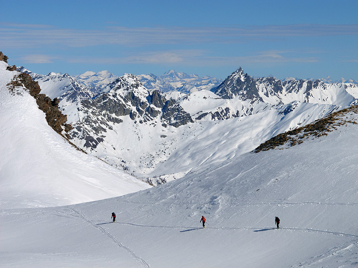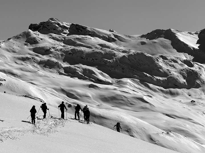 After a rather-too-generous lunch at the Refuge de la Blanche, we headed up for an afternoon lap to the Col Blanchette below the impressive Tête des Toillies. This fresh-fallen north-facing snow was much more promising! |