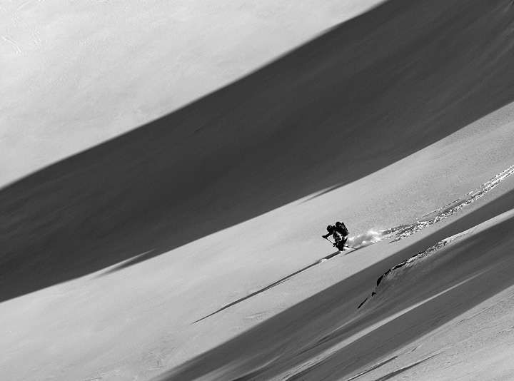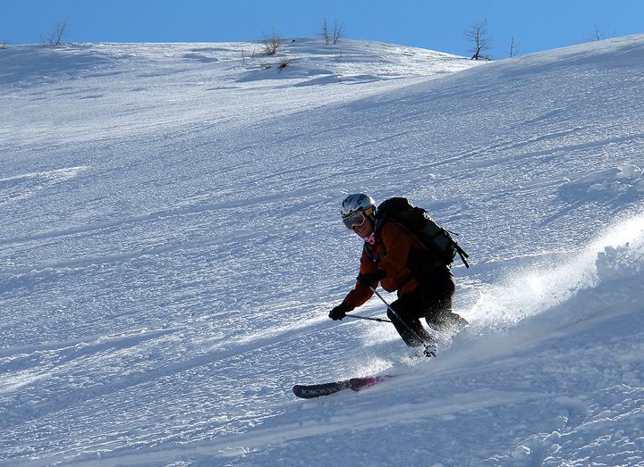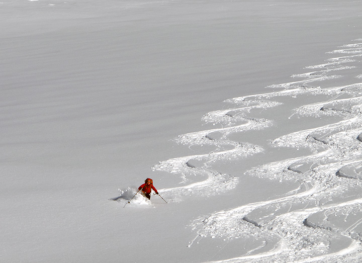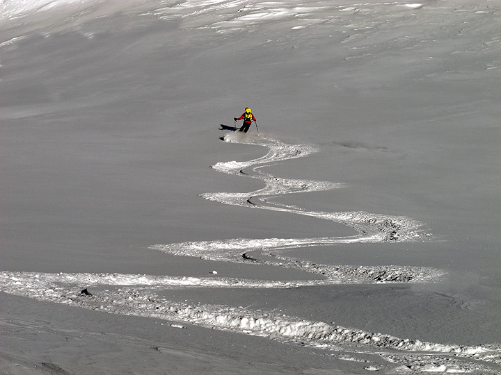 Mo enjoys yet more wonderful snow on the north-facing descent. |