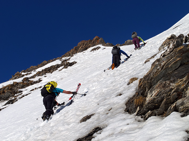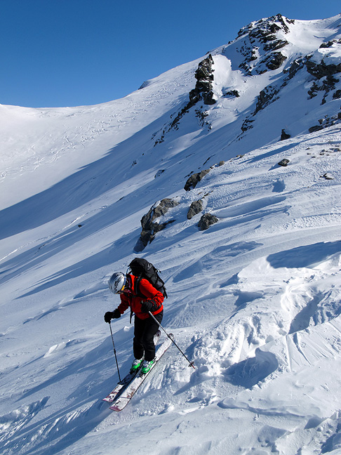Beginning our descent off the SW facing slopes, we have to negotiate a few rocky patches before hitting more consistent snow below. |