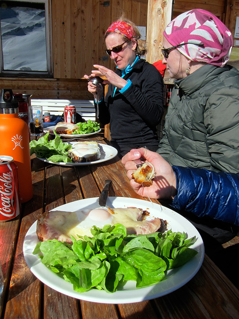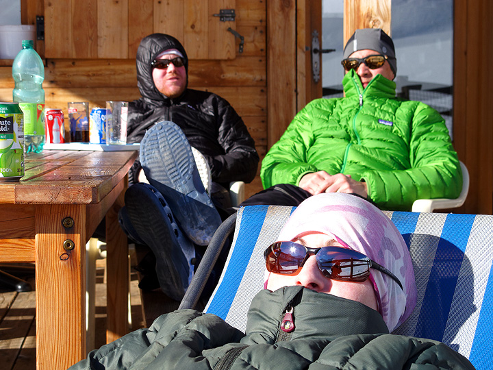 Sunny, not quite warm! Taking a well-deserved break at the hut after an ascent of the Pic de Caramantran. |