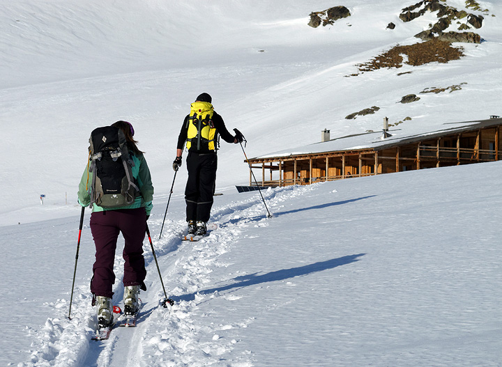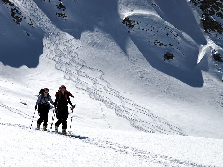 The next day we have a couple of cols to cross before descending to Ristolas. We head out early across very wind-scoured and variable snow. |