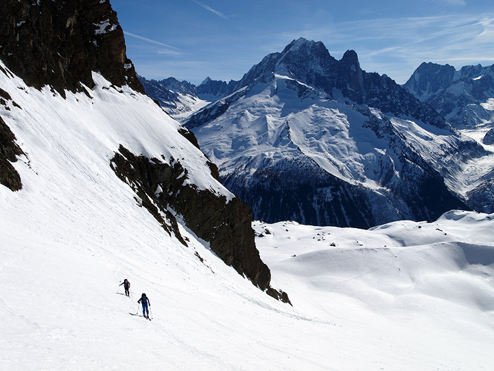 Higher up we enter the slope that leads to the Col. The Aiguille Verte, Les Drus and the Grandes Jorasses behind. |
