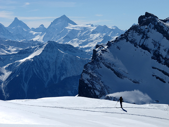 Following our Queyras trip, the threesome planned 4 days of more skiing with Kathy and Mark. We wandered far and wide, starting with a one-day tour in the Chamonix area, the traverse of the Col Beugeant. Moving right along, we did a two-day traverse of the Wildstrubel, starting in Crans Montana and ending in Kandersteg. And for our last day, Zermatt's classic Schwarztor. |