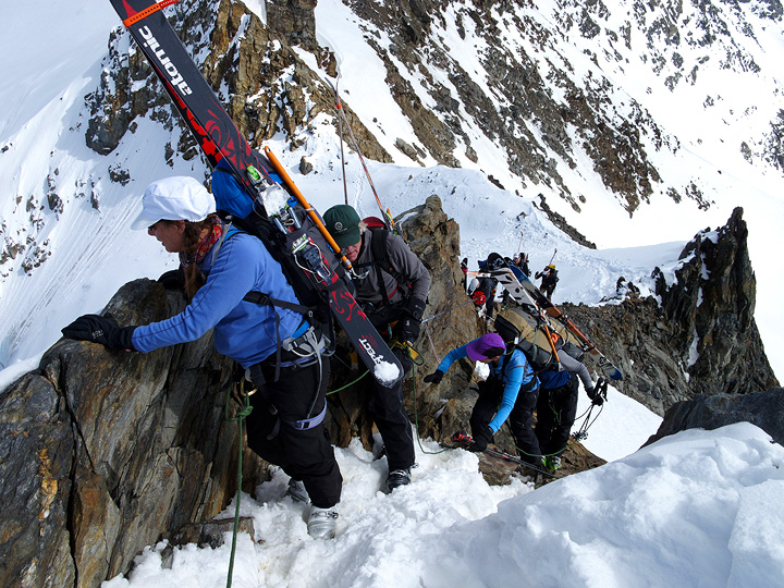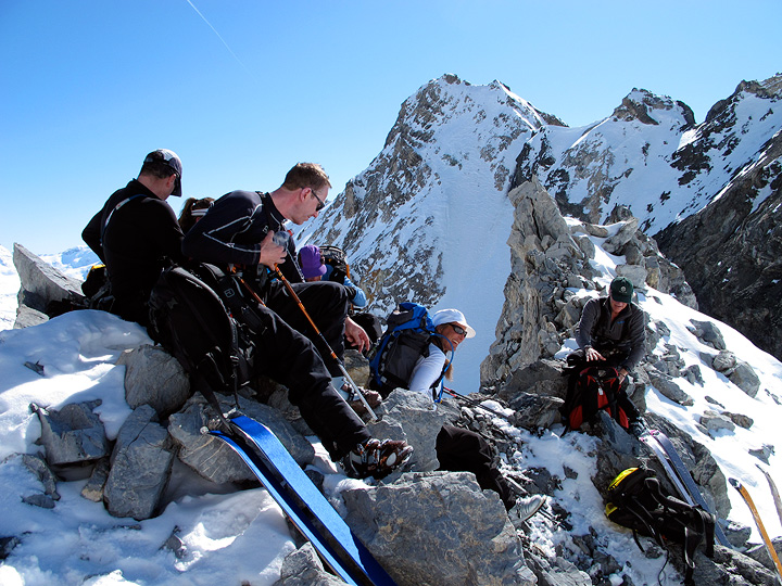The col itself was quite melted out, and we had the "bonus" of some genuine alpine climbing! A brief but sharp and exposed section of mixed snow and rock climbing with skis on backpacks. Yahoo! |