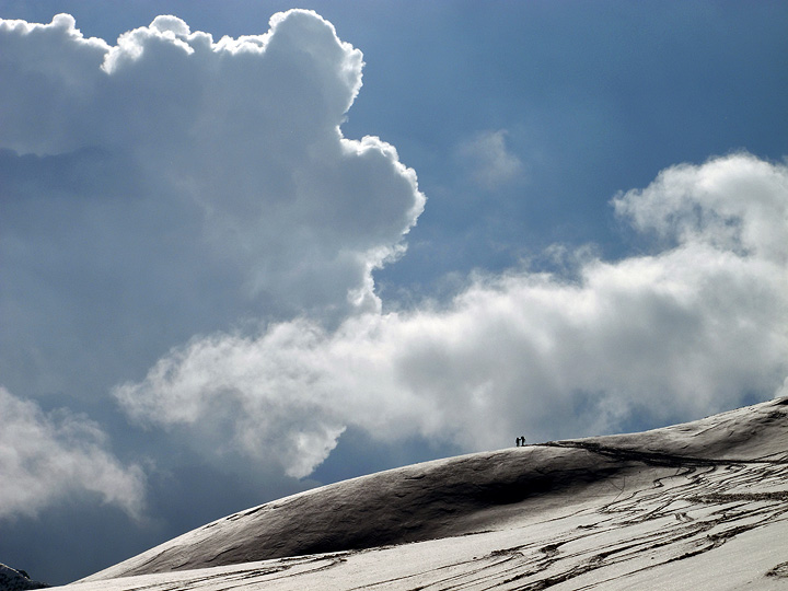 Heading up to the Cevedale-Pasquale Col, we see that north facing snow is still cold, soft and light. Something to look forward to! |