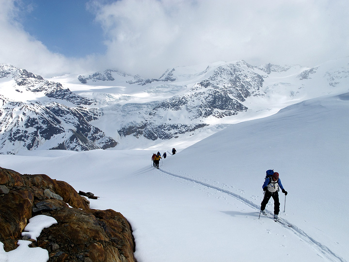 The approach to the Marteller hut. While most of Switzerland particularly to the west and north had a big snow year this season, here in the far east and south the snowpack was quite meager. Still enough to ski on, we did worry about rocks here and there on the first day. A new snowfall a couple of days prior helped give a "fresh coat of paint" that was much needed. |