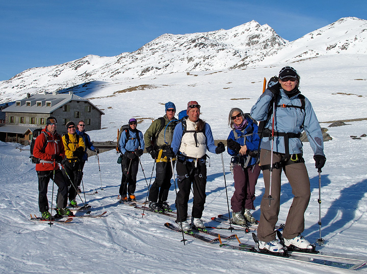Starting out from the Pizzini hut near the end of our tour, the group is all accounted for. On the far left and right are Shaun Guyton and Amy Caddell, both of whom were with us on the Haute Route in 2011; behind Amy is Kathy, and onward from right to left are Sola Didomenico and Dennis Vogler, Debbie Pierce and her husband Bill in the yellow jacket, all four of whom were also with us on a Haute Route in 2009. Finally, hiding in back is Darryl Henson, from London, on his first hut-to-hut ski tour. |