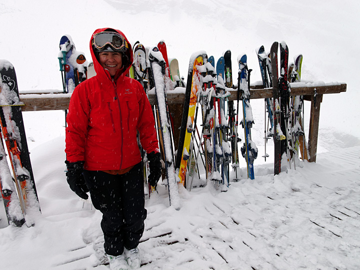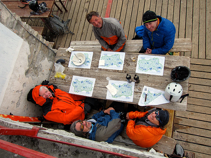 On day 2, we toured in varying thicknesses of fog most of the morning. Back at the hut, the snowfall settles in but we're happy enough having lunch outdoors on the terrace. |