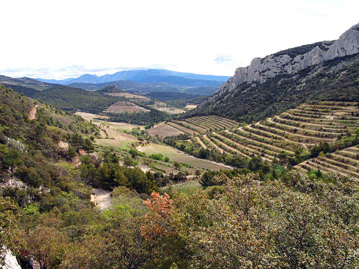 Looking at the weather maps, it was clear that this vast low pressure system, in fact a "named storm" called Julia, was parked over the entire Alps and would be for some days. In fact the only part of Europe that looked as though it would remain dry, was just south of us in Provence. Interest in rock climbing and wine tasting led to a decision to put away the skis and salvage the trip with more touristic pleasures in the Côtes du Rhone. We drove to Vaison La Romaine, shown here in a photo taken from our hotel in the medieval part of town. |