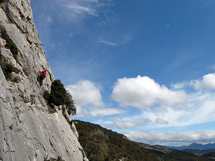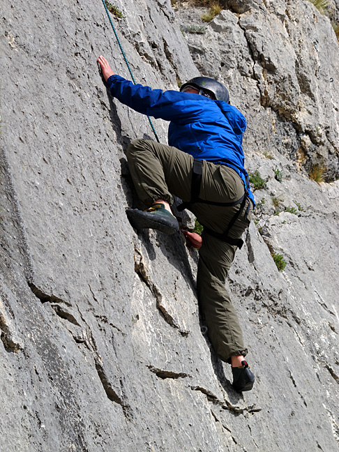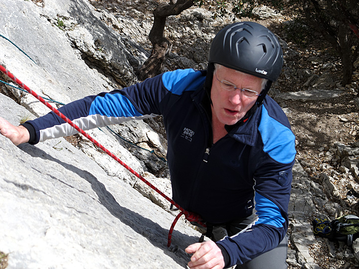 Though far from hot, the weather was dry and the sun poked out from time to time. Marc cranks some thin face moves in the Dentelles de Montmirail. |