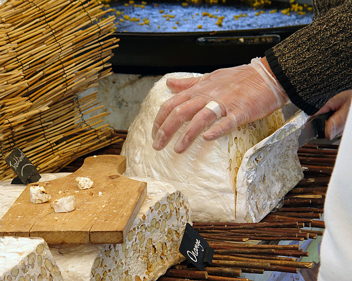 This temptation nearly turned Kathy's head, but she cruised on by. Mark, less susceptible, had the courage to take a photo of the delectable almond nougat on offer. |