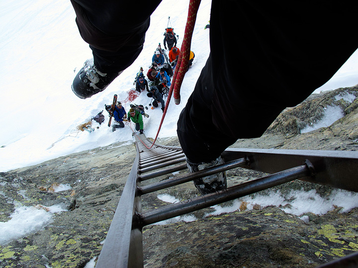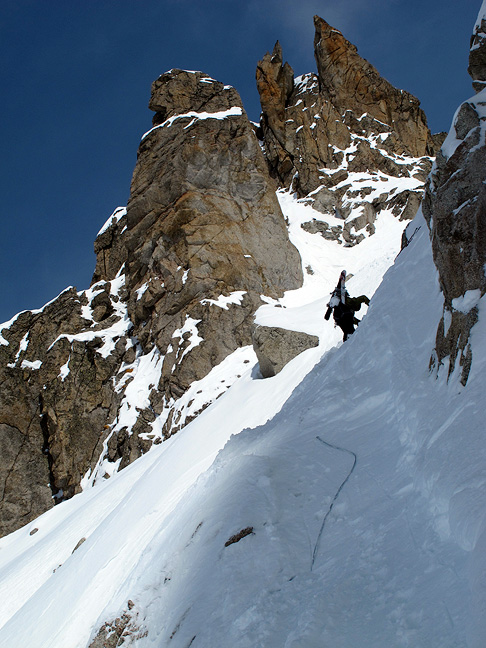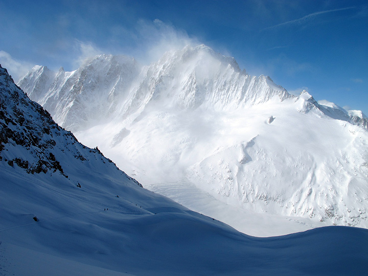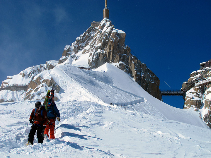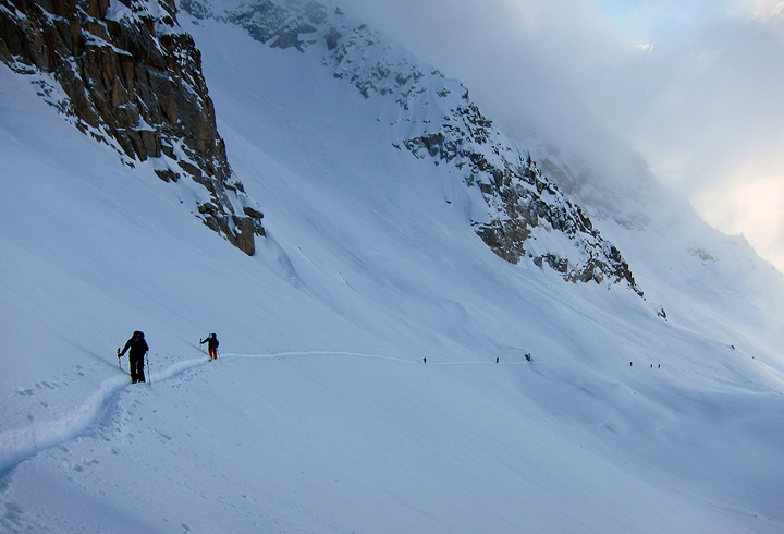 There had been heavy snow already the night before, and the first teams down the ridge of the Aiguille du Midi had deep trail-blazing to do. Our timing was perfect, right after the re-establishment of the track. Needless to say it was a powder day, though a bit heavy by the time we reached the bottom. |