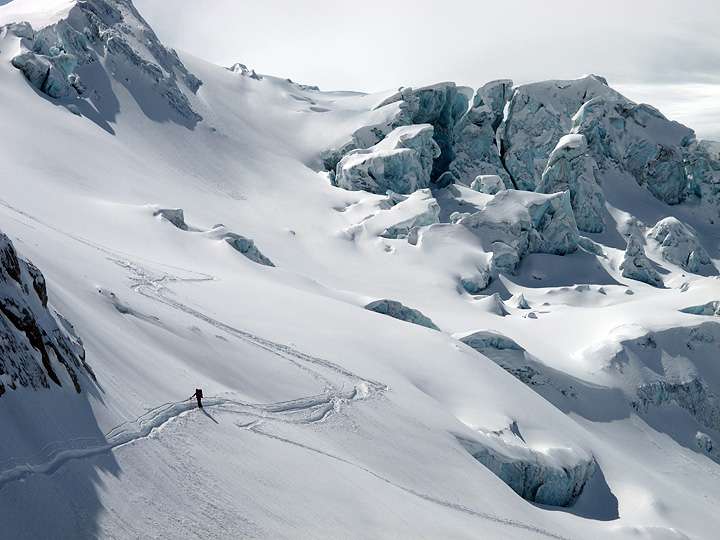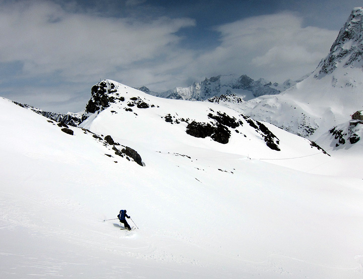 The forecast called for very heavy snow this night, so we cruised right on past the Trient hut, to cover the steep terrain below while snow conditions were relatively settled. A skier makes the hard right at glacier's edge, to traverse over to the Col des Ecandies. |