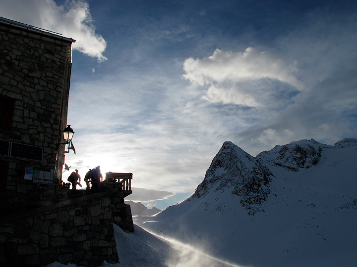 The following day we headed up to the Argentière hut, again in mixed weather. Sophie and Zack enjoy the sunset from the terrace. |