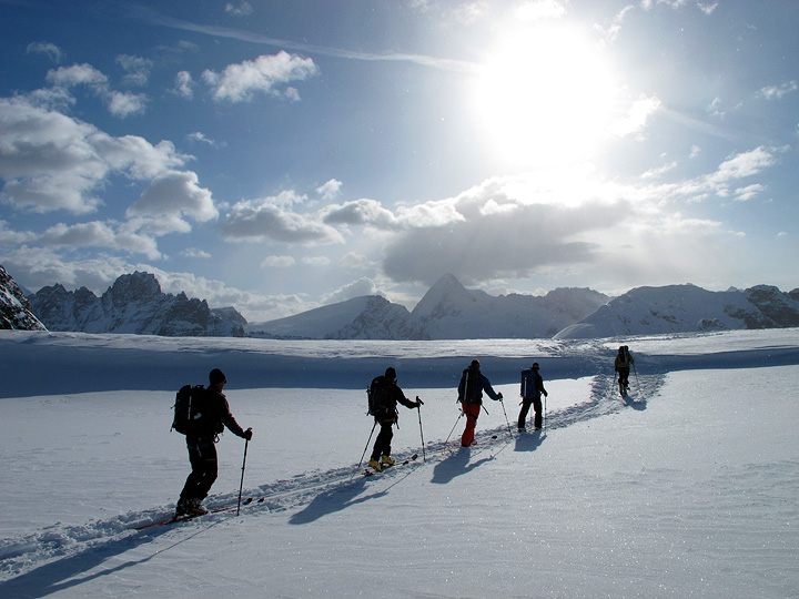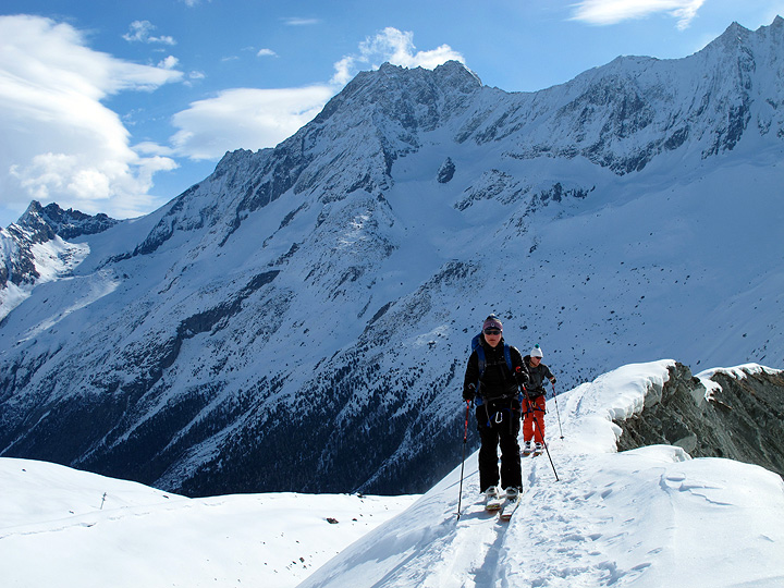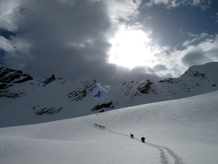 Booting up to the Col des Ecandies, a side-slip track made by descending skiers makes the trail breaking easier. From here we enjoyed a lovely ski down the Val d'Arpette in fresh snow, to a hiker's pension in Champex where we spent the night. |