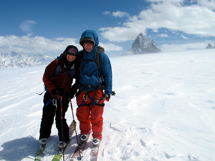 Arriving on the Col de Vallpeline after a long skin, the wind keeping us cool, we are rewarded by our first close-up view of the Matterhorn. |