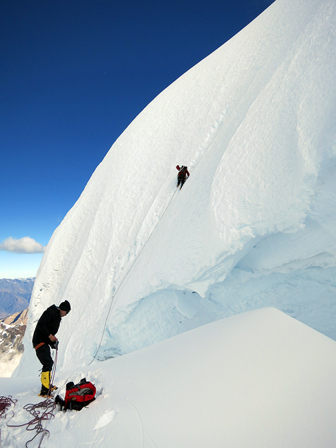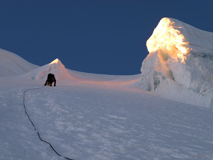 After several hours of slow but steady progress, we encountered this especially steep slope at a little over 100 meters from the summit. Often steep, this slope was made particularly strenuous and insecure by the completely un-consolidated snow conditions. William Alvarado tackles the steepest pitch with panache and aplomb, but found no snow or ice capable of holding a belay anchor. We called him back, unwilling to oblige everyone to essentially solo up (much less down) this exposed slope. |