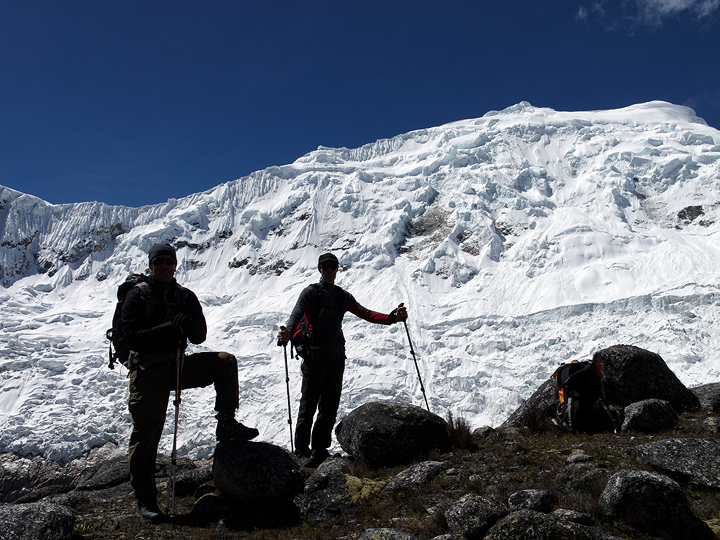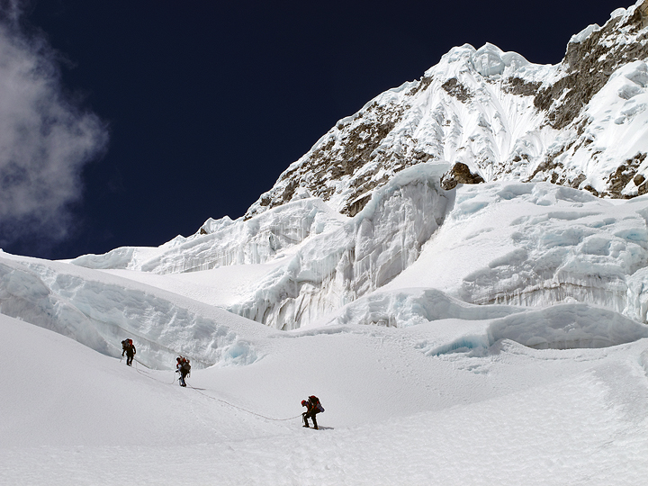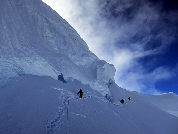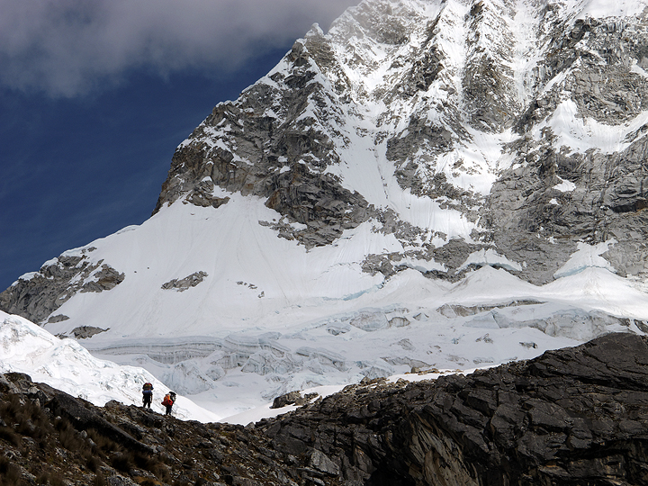 An acclimatization hike above our base camp, takes us close under the west facing wall of Palcaraju. |