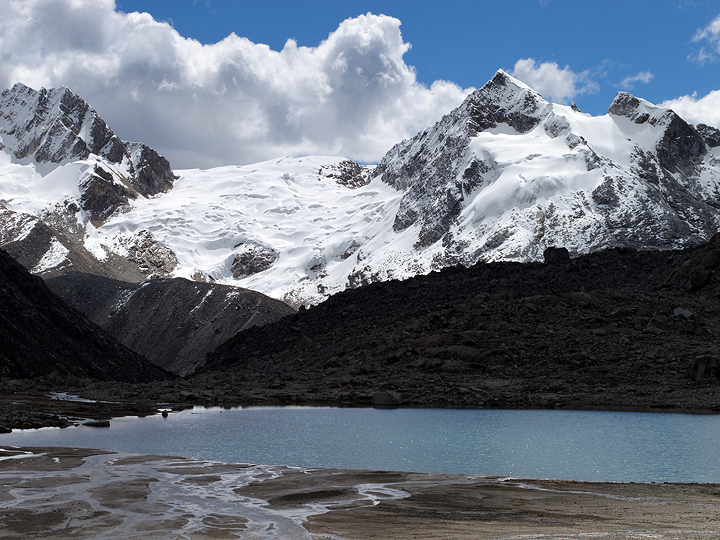 After our rest day, we load ourselves up again and head for Chopicalqui's Moraine Camp. Nearing the camp, the East Ridge of Huascarán Sur looms large. |
