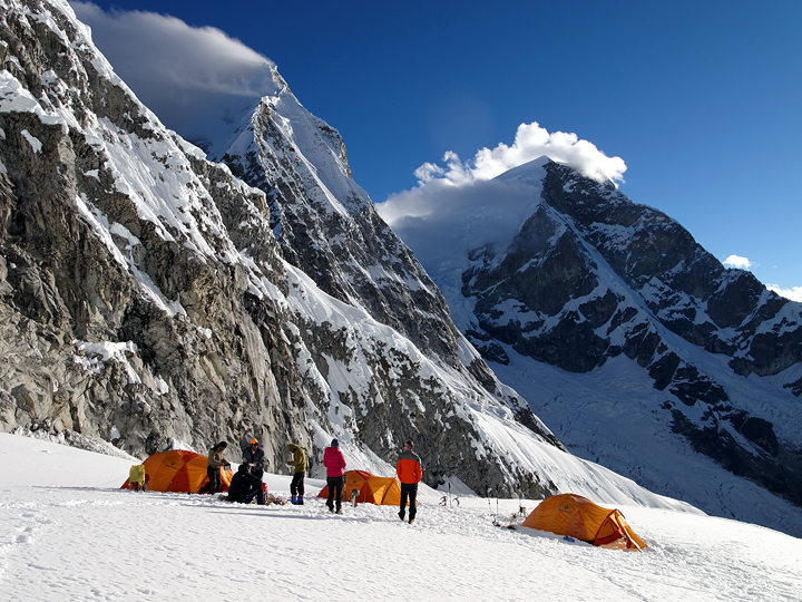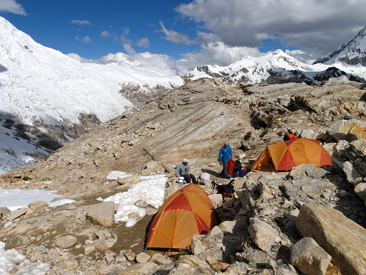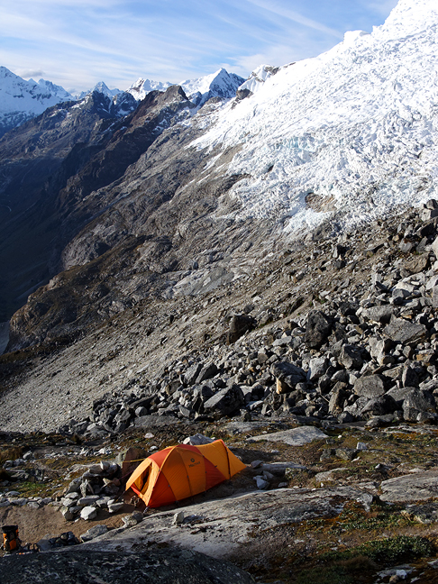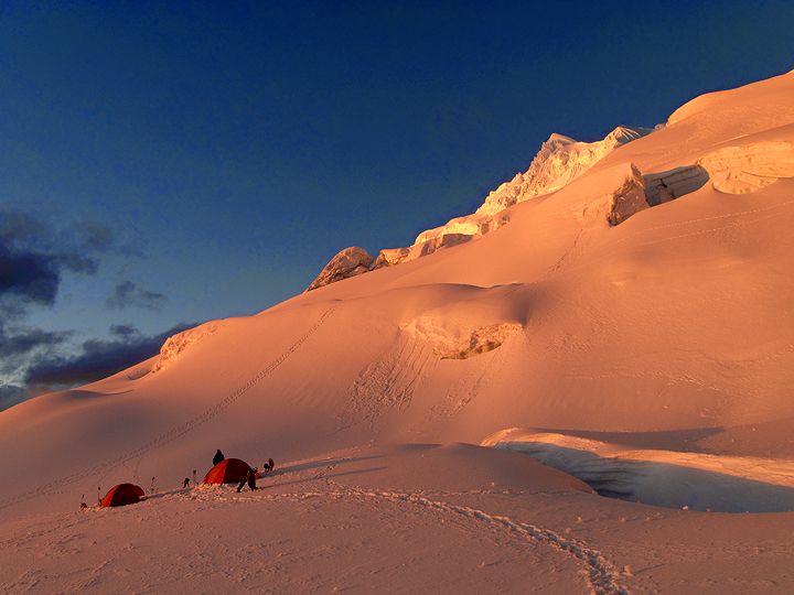 Evening in high camp, with unusual up-close views of Huascarán's peaks catching clouds. |