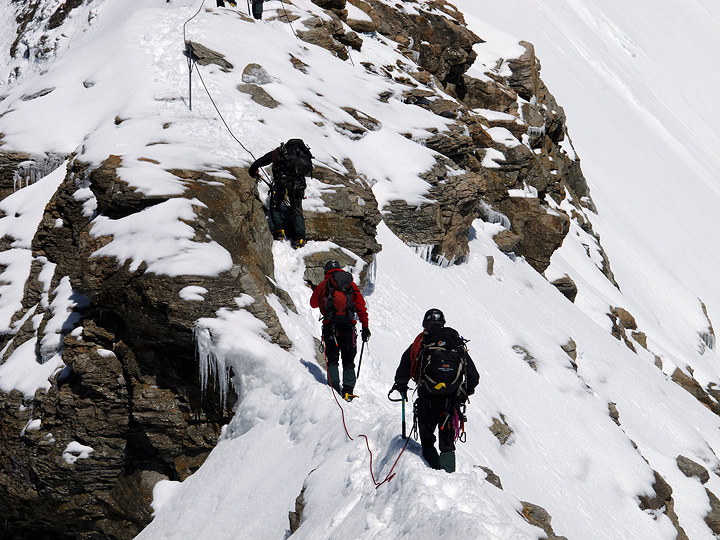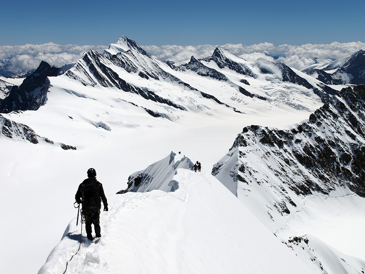 Climbing on the Jungfrau. The Rottalsattel on the left and the summit on the right. |
