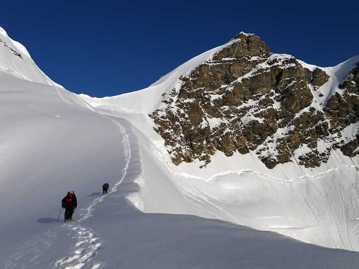 For better or for worse, however, we did not reach the summit. The previous day's climb had taken it's toll, and with a poor night's sleep at the hut, rapidly warming temperatures and desire to maintain a sensible degree of conservatism all led to the decision to forego the highest point. Here, we are descending below the Rottalsattel. |
