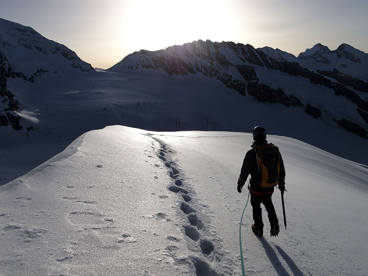 Bruce took a few days out of his Swiss vacation to climb the Mönch and Jungfrau in the Berner Oberland. Luckily, sunny skies arrived just in the nick of time. But so did the hot weather, making for rather soft snow conditions once the day warmed up. |
