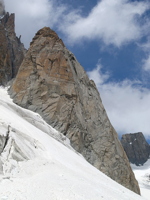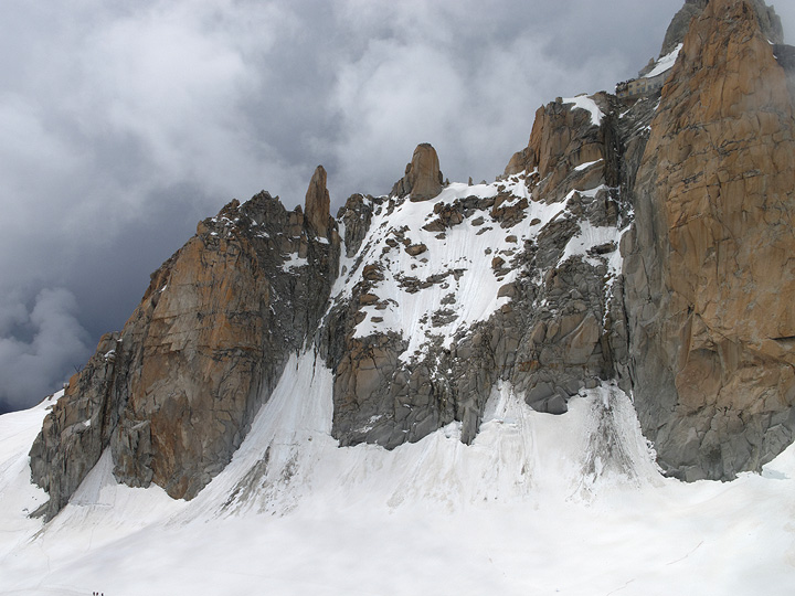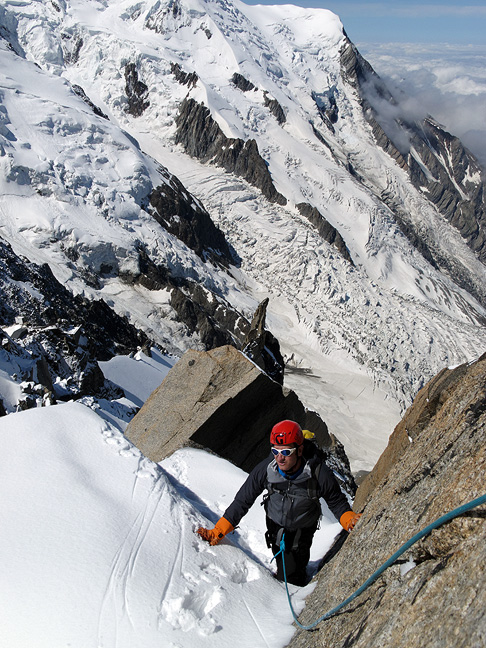 Our last climb was on the Pyramide du Tacul, a satellite peak of Mont Blanc du Tacul. This rock route climbs close to the right-hand skyline in some nine pitches. |