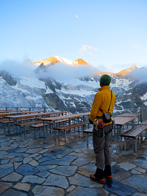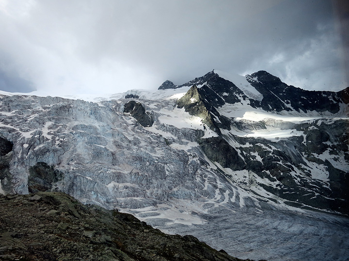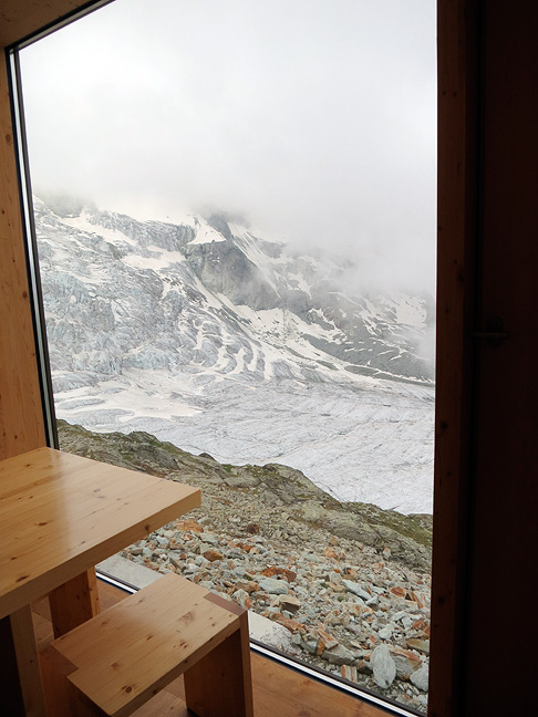 The trip did not start very auspiciously however, as we approached the beautifully situated and renovated Moiry hut in damp and fog. Still, the view out the dining room picture windows is always dramatic. Looking down onto the Moiry glacier and its icefall. |