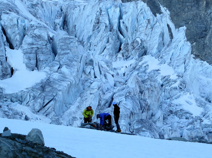 Our first objective was the Pigne de la Lé. A short approach hike leads us to a crampon-up spot overlooking the Moiry glacier icefall. |