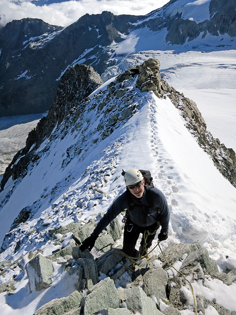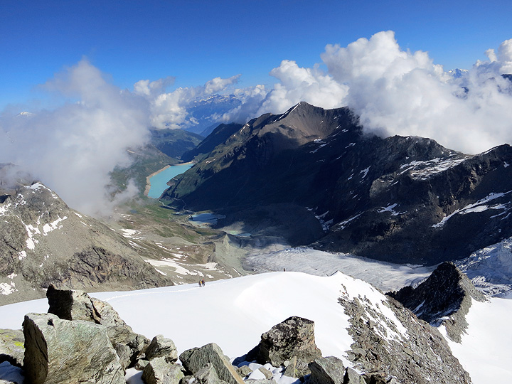 Starting back down from the summit, with the Lac Moiry behind. |