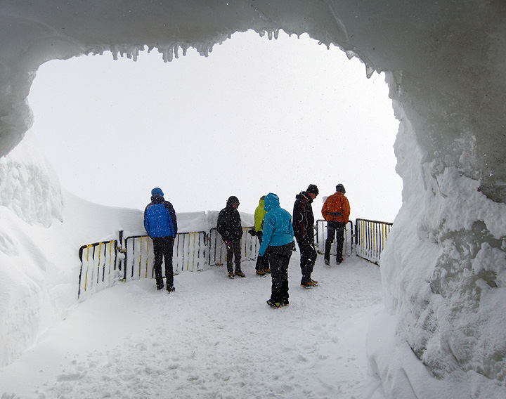 So off we went, and though the clouds did clear considerably, to make a long story short we did not have the visibility nor tracks to follow, that would have made the wander through the icefall safe enough. We turned back about halfway, and by the time we got back up to the Aiguille du Midi, conditions had turned to blizzard and white-out. Kathy stopped taking pictures during this half of the day, sorry! |
