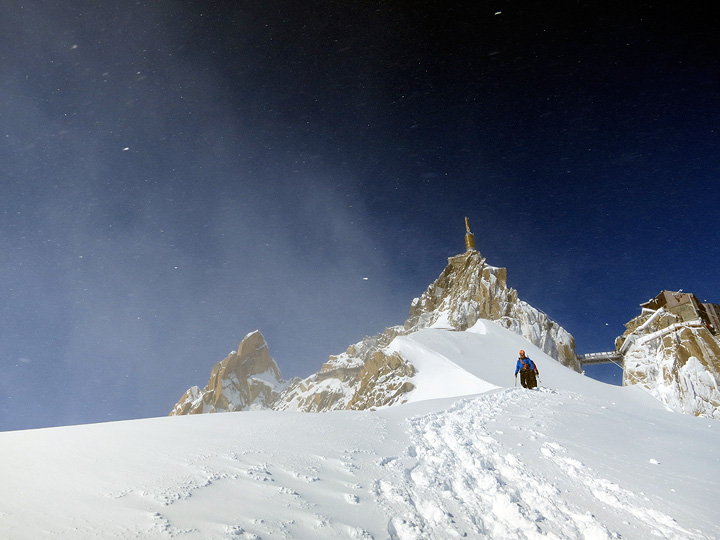 Kathy and Mark ready to roll at the top of the Aiguille du Midi. Notice the dry clothing and poised attitude. |