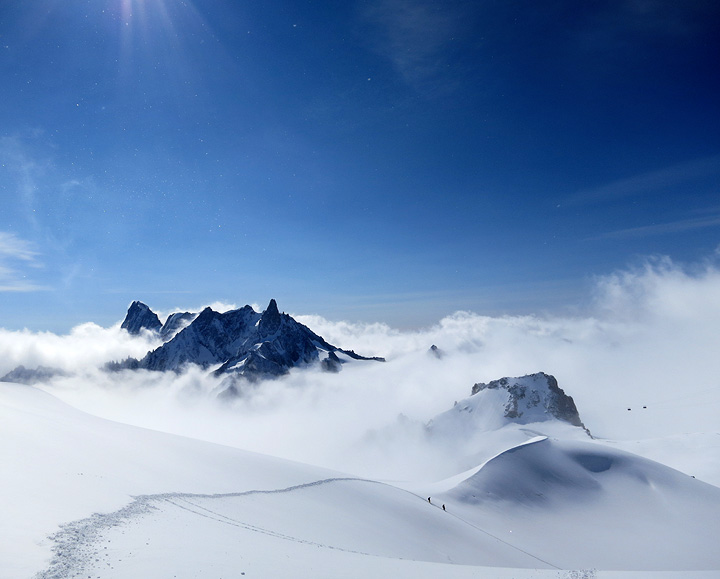 The Grandes Jorasses and Dent du Géant rising above the clouds. |