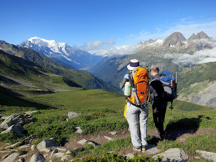 Our trek began above the village of Le Tour. Starting along the trail we have a magnificent view down the Chamonix valley to Mont Blanc. |