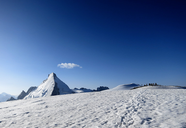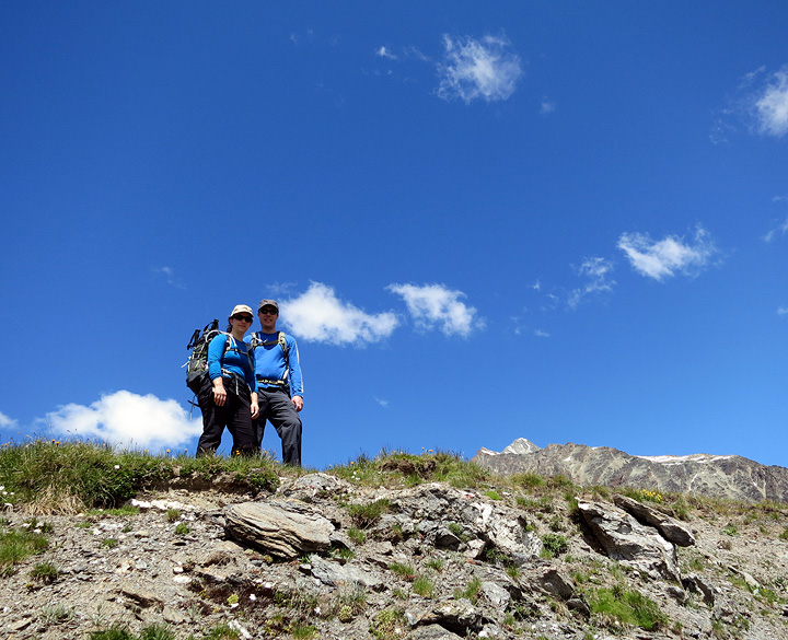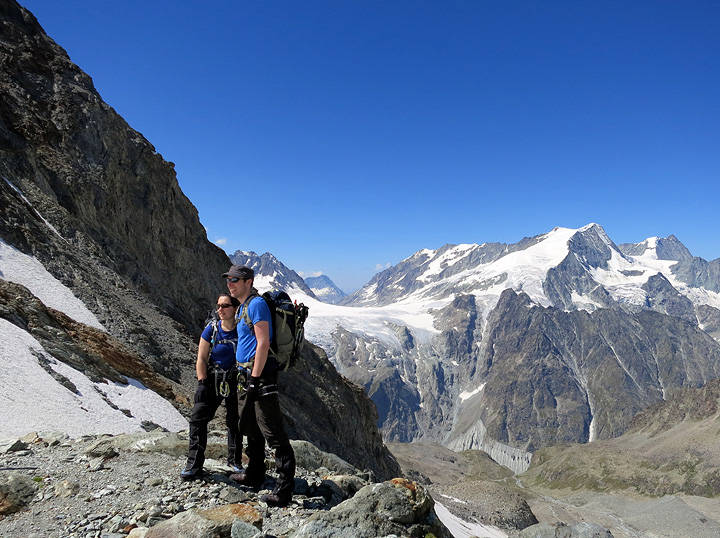 Once back up among the eternal snows, Jane and Jules pause for a photo. The Pigne d'Arolla behind. |