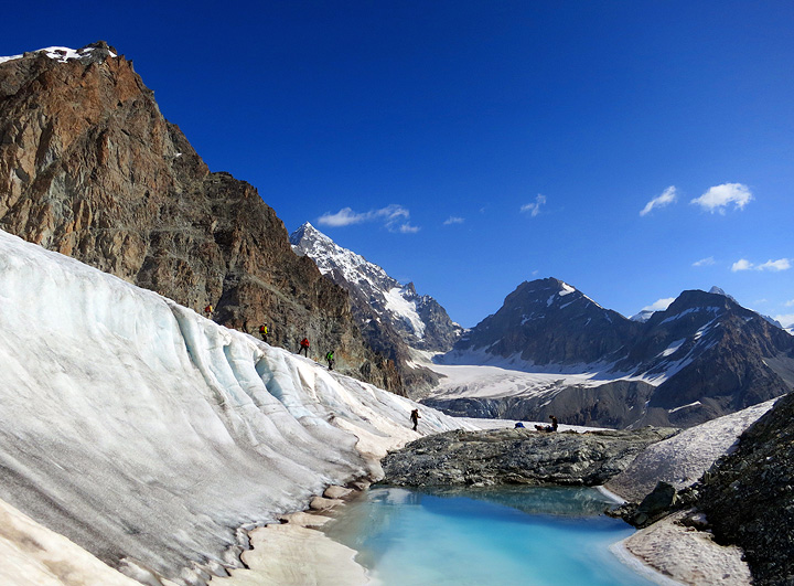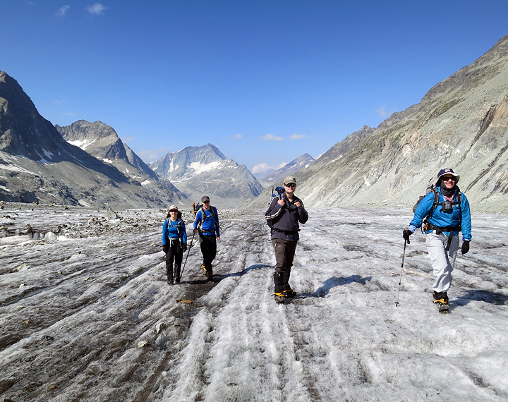 Day three turned out to be better weather than it appeared in the wee hours of dawn, here we are about halfway up the Otemma Glacier. |