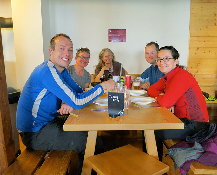 Here we all are at the Vignettes hut, if not looking our absolute best, still feeling pretty good on day 3. From left to right: Jules, Susan, Kathy, Aaron, and Jane. |