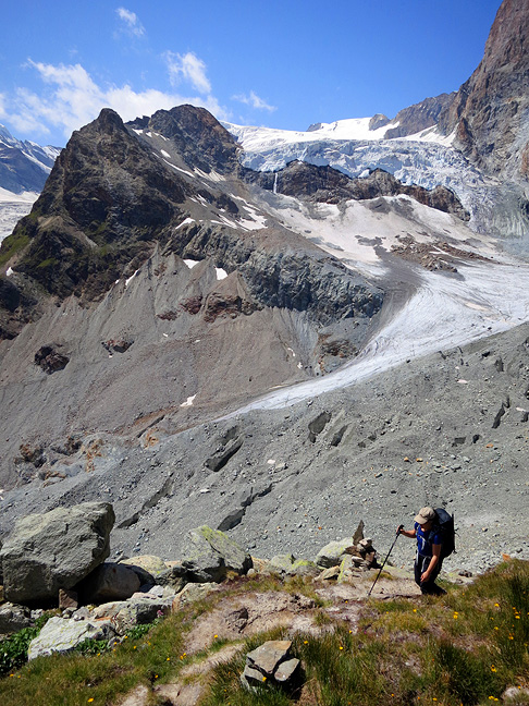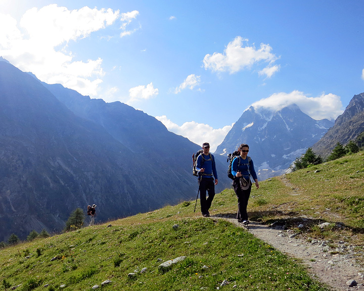 The next morning we had only a relatively short downhill hike to Arolla, and a well-earned bit of relaxation. Approaching the Arolla pine forest, with Mont Collon in the background. |