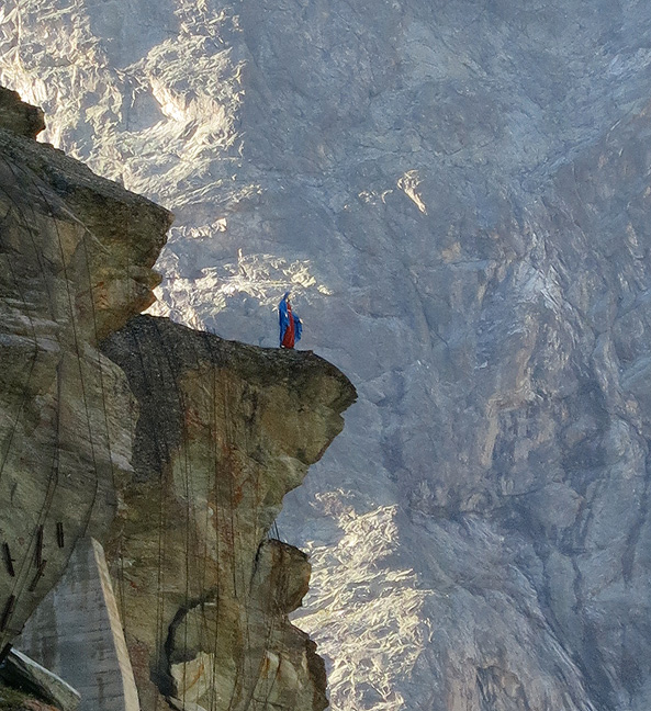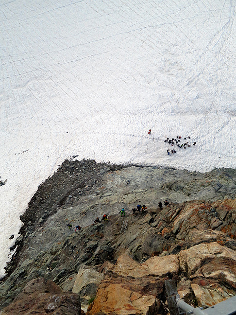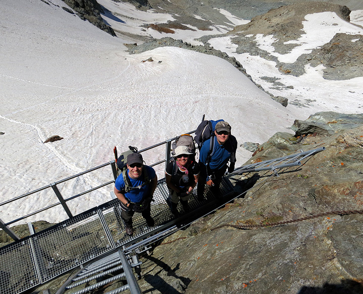 The next morning starts with a bang as we have to descend still more vertiginous ladders to the Mont Miné glacier. Our hut-mates look like tiny ants at the base of the cliff. |